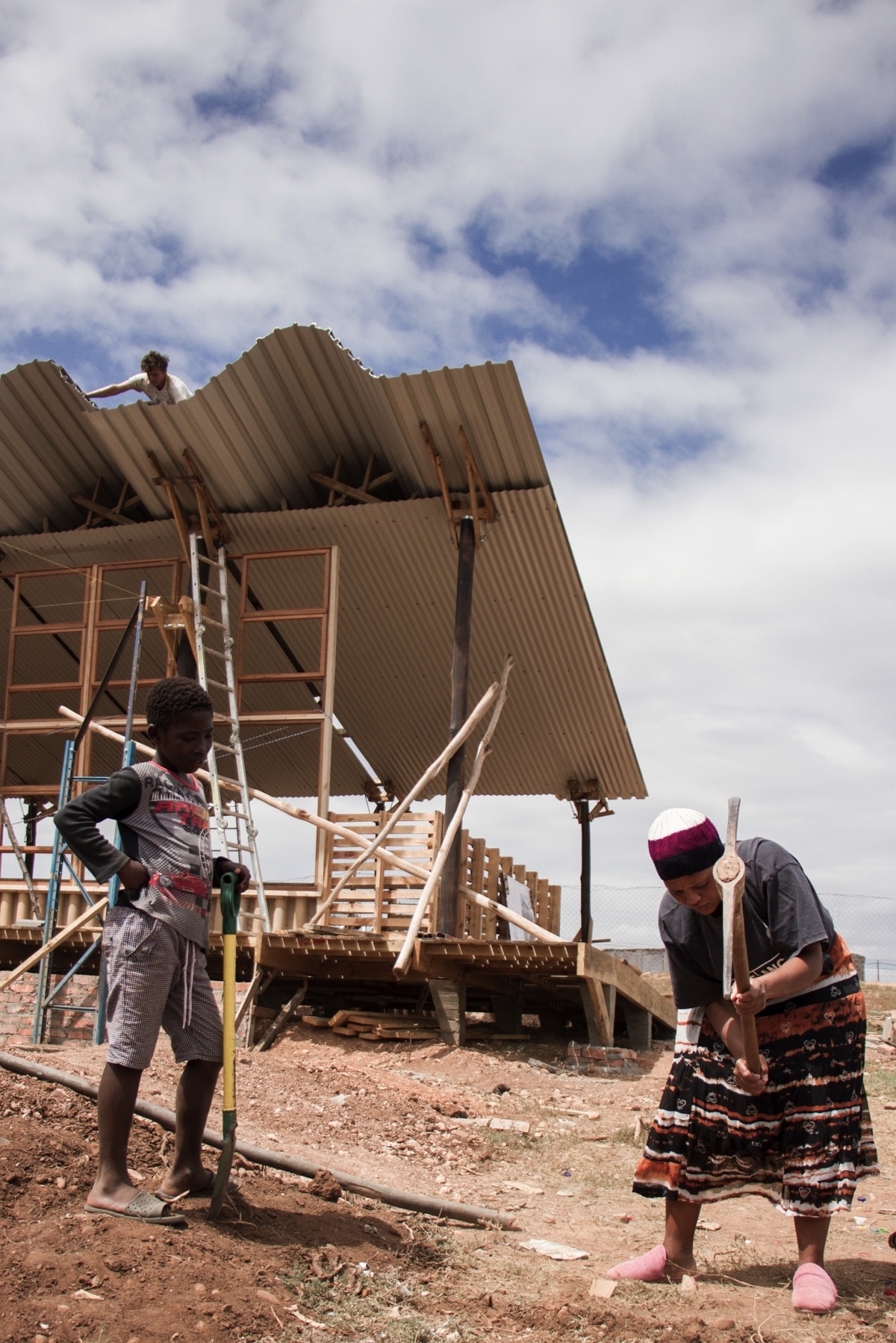Joe Slovo West, quartier en plein développement et renouvellement, chantier de constructions de maisons du gouvernement pour remplacer les shacks, littéralement ‘cabanes’, préexistantes. Population d’Afrique du Sud déshéritée qui se reconstruit sur elle-même, dont l’attente est enfin récompensée par l’unité architecturale de la RDP, unité bâtie à-coups de milliers d’exemplaires, sans distinction, sans discernement, réponse hâtive à une urgence du nombre.